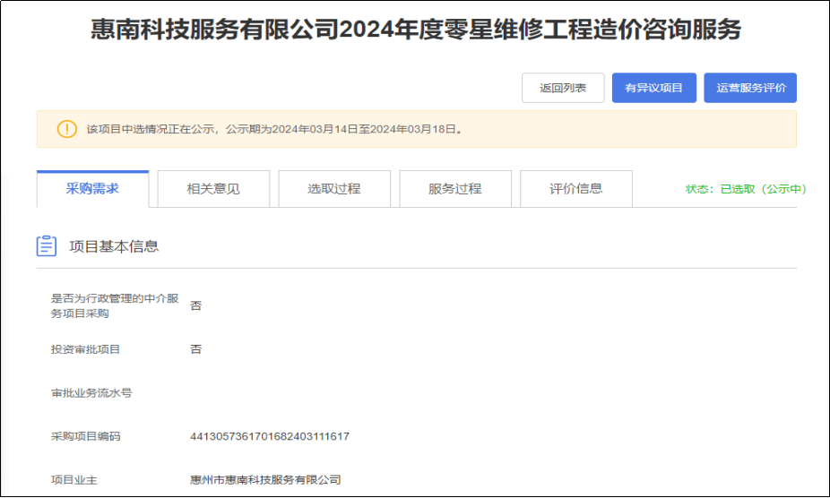 惠南科技服務(wù)有限公司2024年度零星維修工程造價咨詢服務(wù)