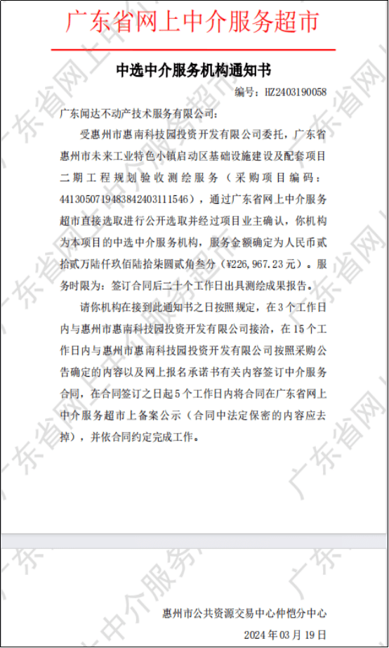 中選中介服務(wù)機(jī)構(gòu)通知書(廣東省惠州市未來(lái)工業(yè)特色小鎮(zhèn)啟動(dòng)區(qū)基礎(chǔ)設(shè)施建設(shè)及配套項(xiàng)目二期工程規(guī)劃驗(yàn)收測(cè)繪服務(wù))