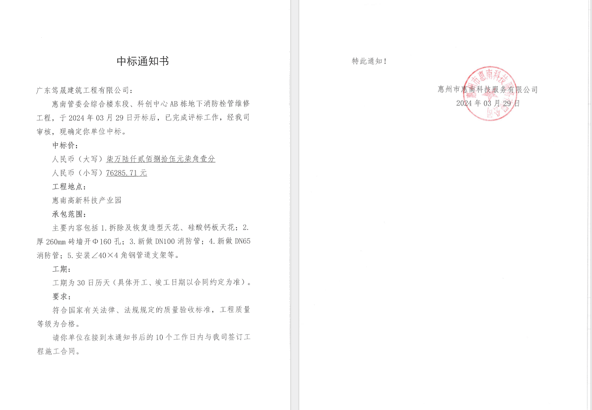 【中標通知】惠南管委會綜合樓東段、科創(chuàng)中心AB棟地下消防栓管維修工程