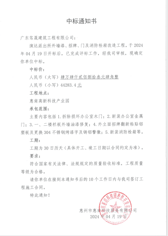 【中標(biāo)通知】演達(dá)派出所外墻漆、招牌、門及消防栓箱改造工程