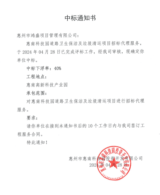 【中標(biāo)通知】惠南科技園道路衛(wèi)生保潔及垃圾清運(yùn)項(xiàng)目招標(biāo)代理服務(wù)