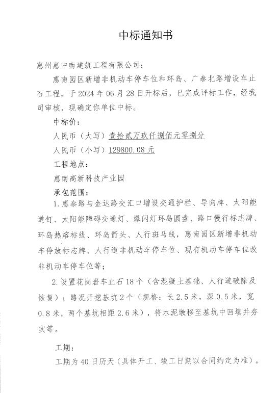 【中標(biāo)通知】惠南園區(qū)新增非機(jī)動車停車位和環(huán)島、廣泰北路增設(shè)車止石工程