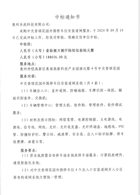 【中標通知】采購中交香頌花園外圍停車位安裝道閘服務