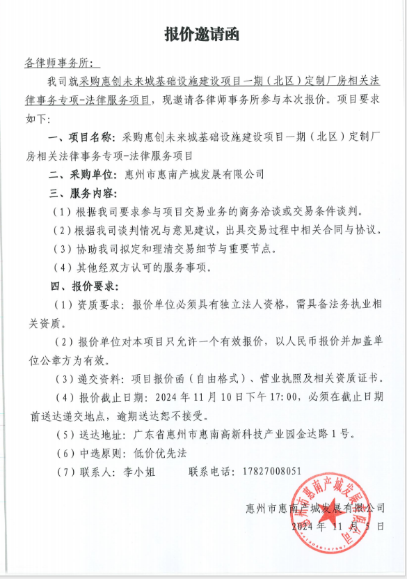 采購惠創(chuàng)未來城基礎(chǔ)設(shè)施建設(shè)項(xiàng)目一期(北區(qū))定制廠房相關(guān)法律事務(wù)專項(xiàng)-法律服務(wù)項(xiàng)目