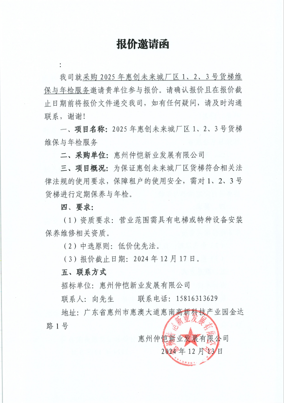 報價邀請函-采購惠南科技園惠泰路1號廠區(qū)1、2、3號貨梯維保單位.docx