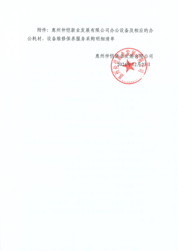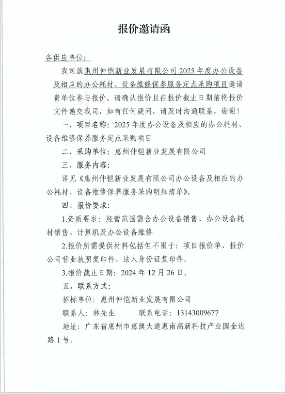 惠州仲愷新業(yè)發(fā)展有限公司2025年度辦公設備及相應的辦公耗材、設備維修保養(yǎng)服務定點采購邀請函
