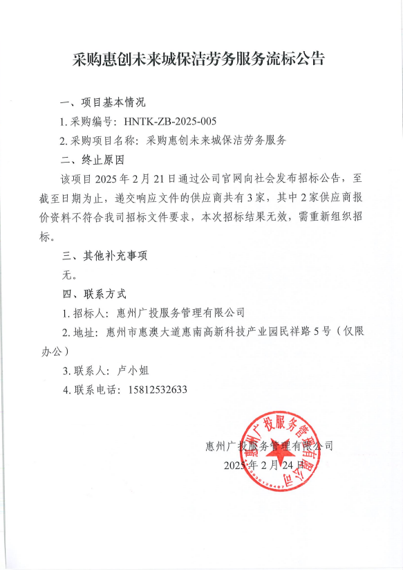 【招標公告】采購惠創(chuàng)未來城保潔勞務服務流標公告