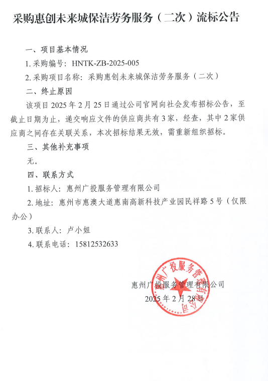 【招標(biāo)公告】采購惠創(chuàng)未來城保潔勞務(wù)服務(wù)(二次)流標(biāo)公告