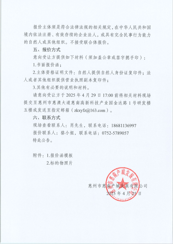【招標公告】惠州市惠南產城發(fā)展有限公司 資產公開詢價及意向受讓方征集公告