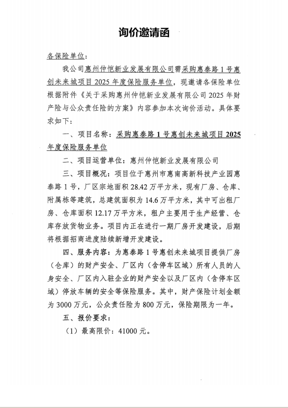 【詢價邀請函】采購惠泰路1號惠創(chuàng)未來城項目2025年度保險服務單位