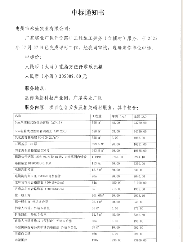 【中標(biāo)通知】廣基實(shí)業(yè)廠區(qū)開(kāi)設(shè)路口工程施工勞務(wù)(含輔材)服務(wù)
