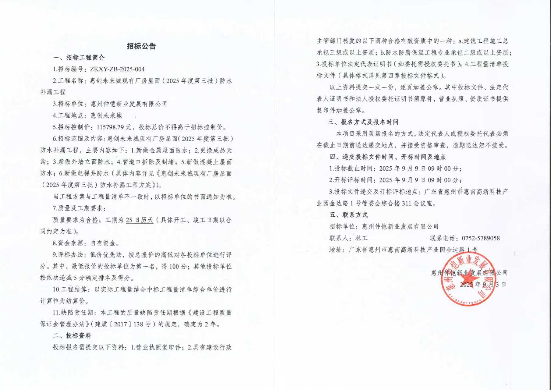 【招標(biāo)公告】惠創(chuàng)未來(lái)城現(xiàn)有廠房屋面(2025年度第三批)防水補(bǔ)漏工程