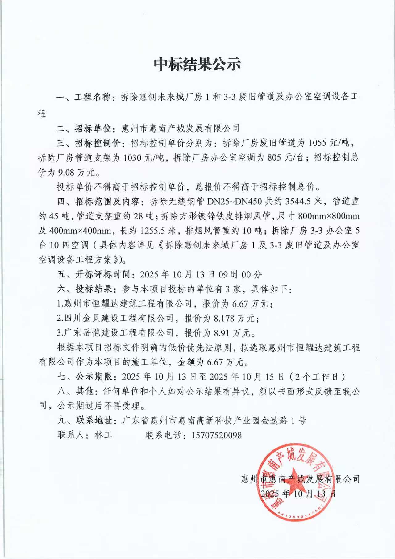 【中標結果公示】拆除惠創(chuàng)未來城廠房1和3-3廢舊管道及辦公室空調設備工程