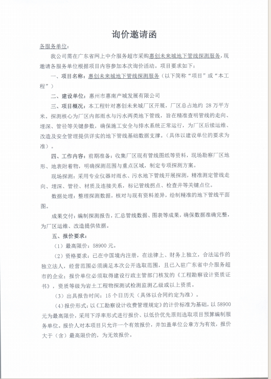 【詢價邀請函】惠創(chuàng)未來城地下管線探測服務(wù)
