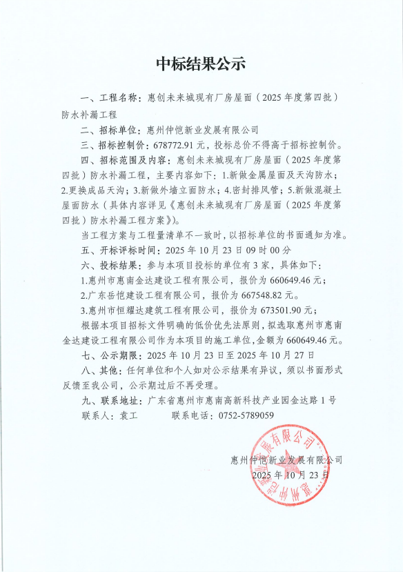 【中標(biāo)結(jié)果公示】惠創(chuàng)未來城現(xiàn)有廠房屋面(2025年度第四批)防水補(bǔ)漏工程