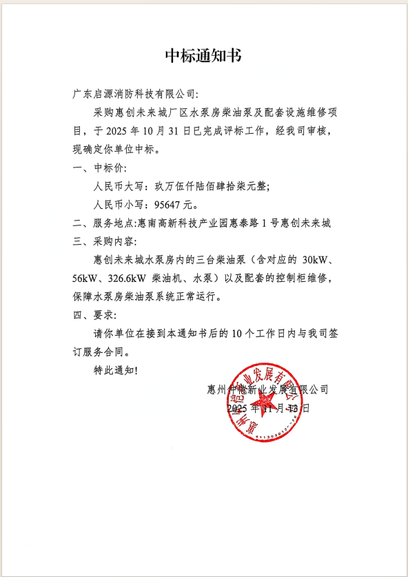 【中標(biāo)通知書】惠創(chuàng)未來城廠區(qū)水泵房柴油泵及配套設(shè)施維修項(xiàng)目