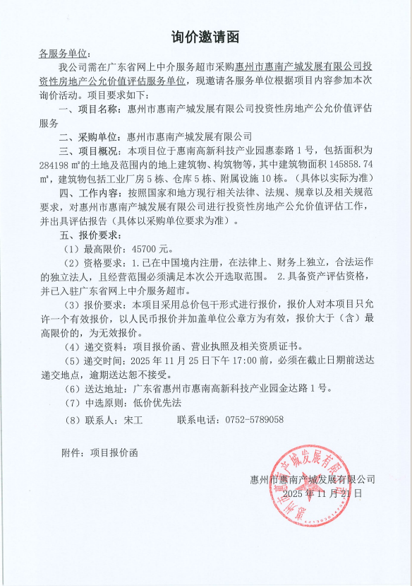 【詢(xún)價(jià)邀請(qǐng)函】惠州市惠南產(chǎn)城發(fā)展有限公司投資性房地產(chǎn)公允價(jià)值評(píng)估服務(wù)單位
