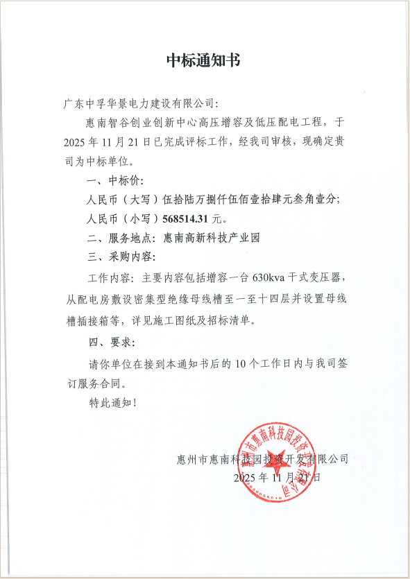 【中標(biāo)通知】惠南智谷創(chuàng)業(yè)創(chuàng)新中心高壓增容及低壓配電工程