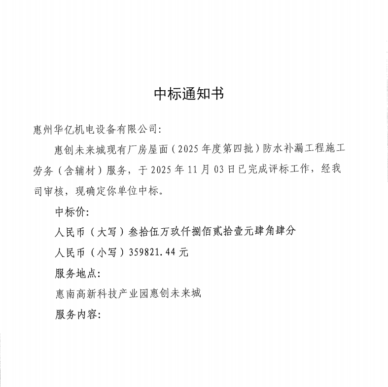 【中標(biāo)通知】惠創(chuàng)未來(lái)城現(xiàn)有廠(chǎng)房屋面(2025年度第四批)防水補(bǔ)漏工程施工勞務(wù)(含輔材)服務(wù)